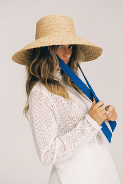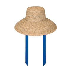 This handwoven raffia sun hat is crafted using tightly woven natural raffia fiber for a lightweight, breathable, and durable finish. Designed for warm-weather wear, it features a wide brim for comfortable shade and includes two interchangeable cotton ribbons—one in azure blue and one in cream herringbone—so you can switch between styles with ease. Ideal for beach days, outdoor outings, and everyday summer looks.